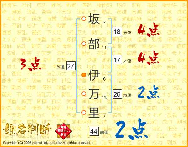 坂(7画)部(11画) 伊(6画)万(13画)里(7画)