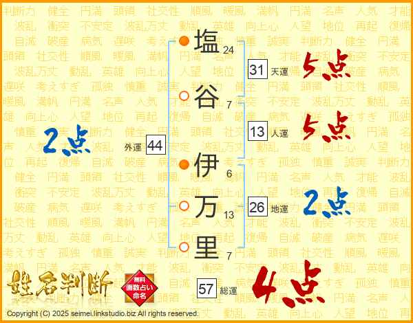 塩(24画)谷(7画) 伊(6画)万(13画)里(7画)