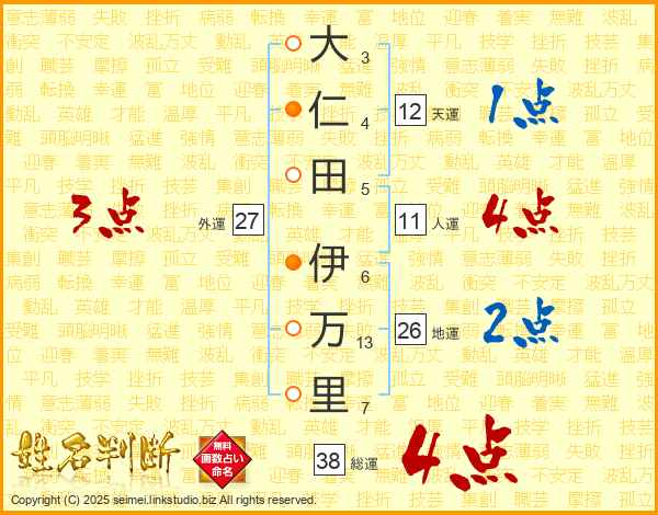 大(3画)仁(4画)田(5画) 伊(6画)万(13画)里(7画)