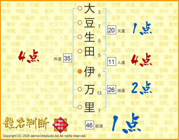 大(3画)豆(7画)生(5画)田(5画) 伊(6画)万(13画)里(7画)