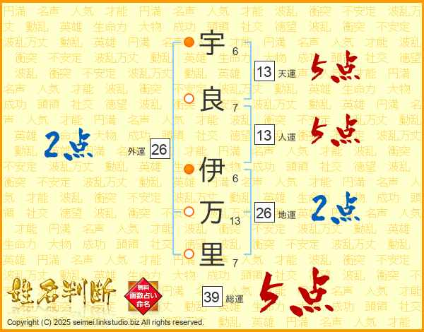 宇(6画)良(7画) 伊(6画)万(13画)里(7画)