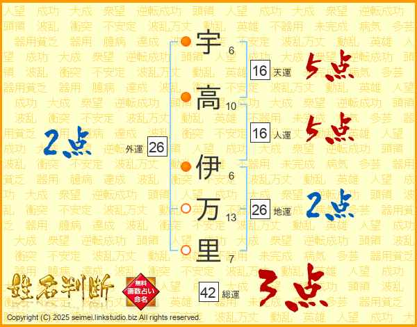 宇(6画)高(10画) 伊(6画)万(13画)里(7画)