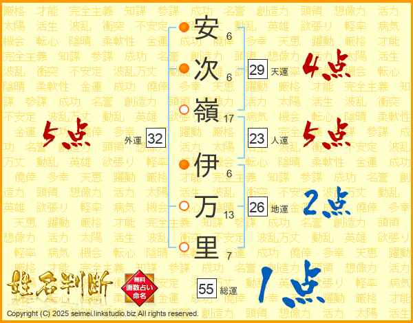 安(6画)次(6画)嶺(17画) 伊(6画)万(13画)里(7画)