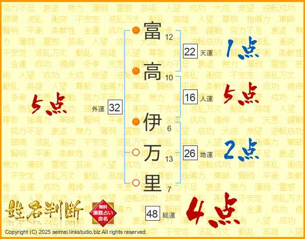 富(12画)高(10画) 伊(6画)万(13画)里(7画)