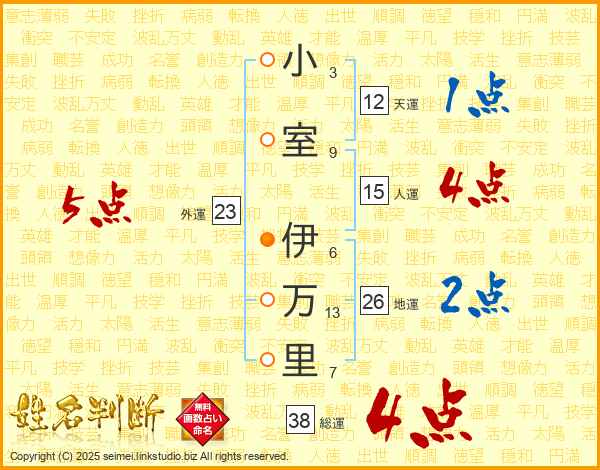 小(3画)室(9画) 伊(6画)万(13画)里(7画)