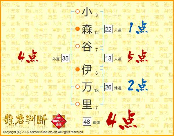 小(3画)森(12画)谷(7画) 伊(6画)万(13画)里(7画)