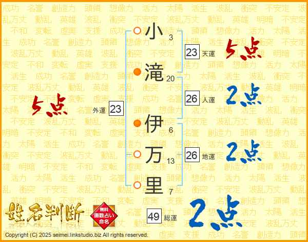 小(3画)滝(20画) 伊(6画)万(13画)里(7画)