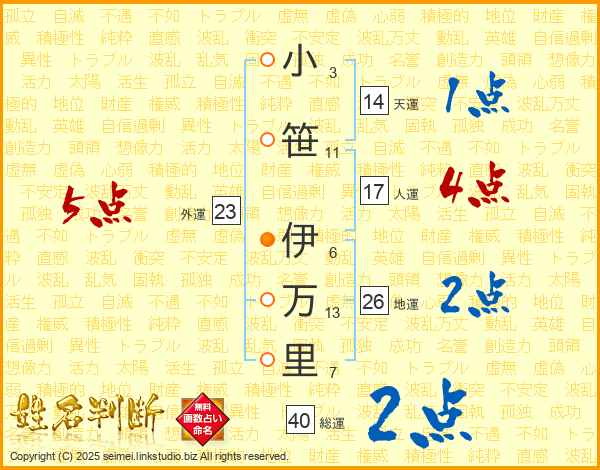 小(3画)笹(11画) 伊(6画)万(13画)里(7画)