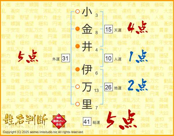 小(3画)金(8画)井(4画) 伊(6画)万(13画)里(7画)