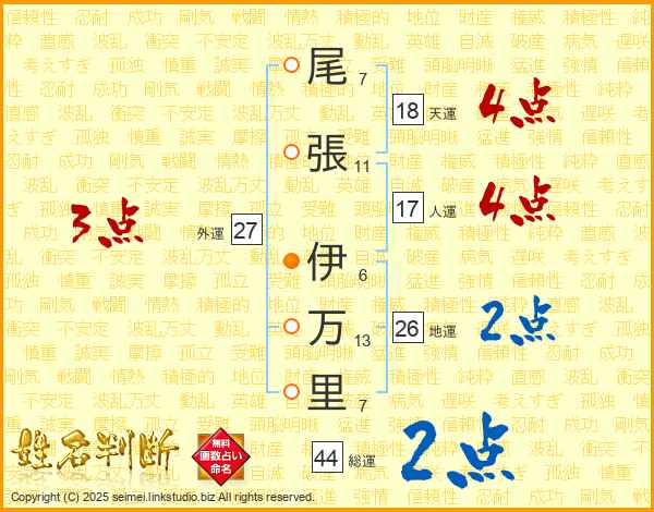 尾(7画)張(11画) 伊(6画)万(13画)里(7画)