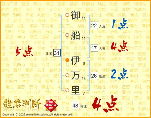 御(11画)船(11画) 伊(6画)万(13画)里(7画)