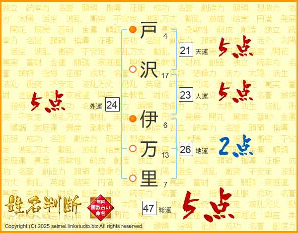 戸(4画)沢(17画) 伊(6画)万(13画)里(7画)