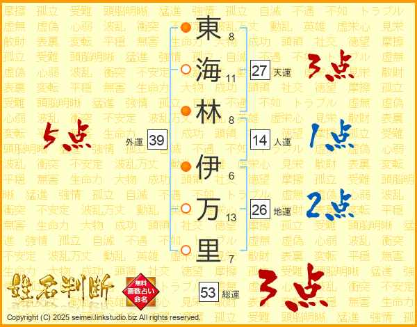東(8画)海(11画)林(8画) 伊(6画)万(13画)里(7画)