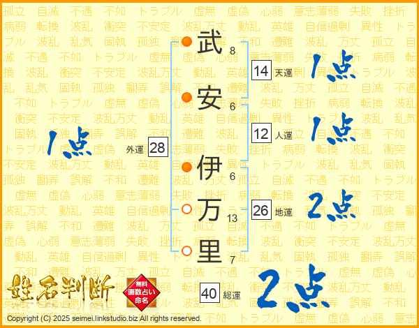 武(8画)安(6画) 伊(6画)万(13画)里(7画)