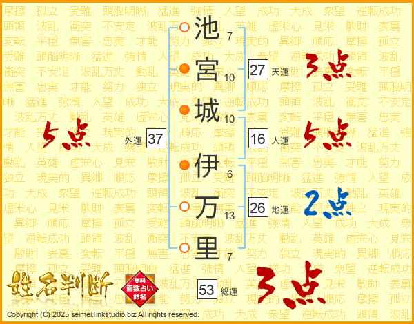池(7画)宮(10画)城(10画) 伊(6画)万(13画)里(7画)