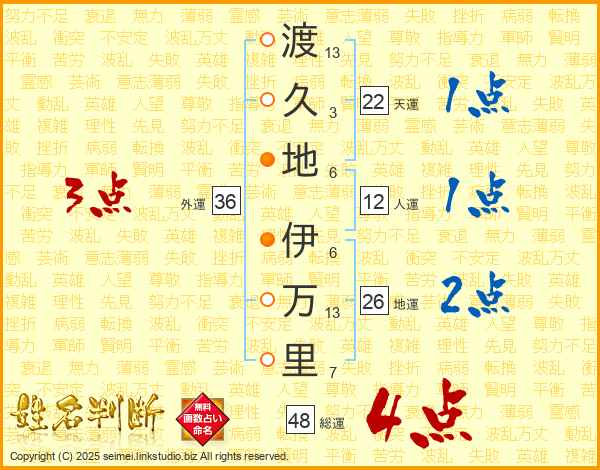 渡(13画)久(3画)地(6画) 伊(6画)万(13画)里(7画)