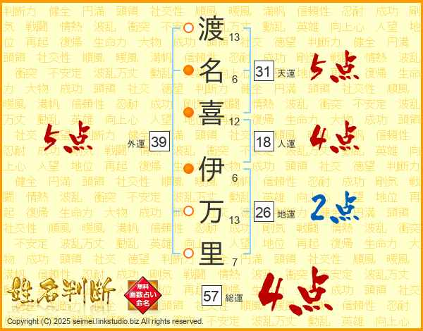 渡(13画)名(6画)喜(12画) 伊(6画)万(13画)里(7画)