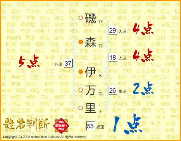 磯(17画)森(12画) 伊(6画)万(13画)里(7画)
