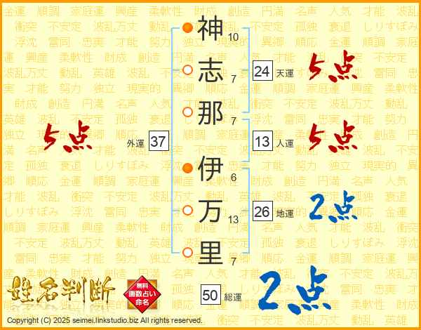 神(10画)志(7画)那(7画) 伊(6画)万(13画)里(7画)