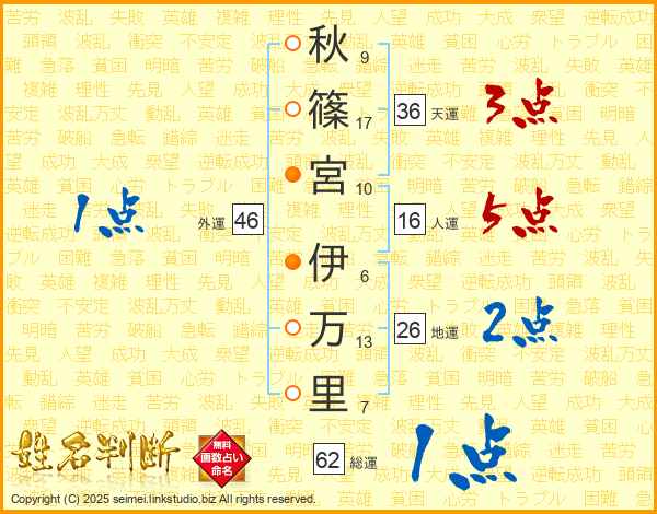 秋(9画)篠(17画)宮(10画) 伊(6画)万(13画)里(7画)
