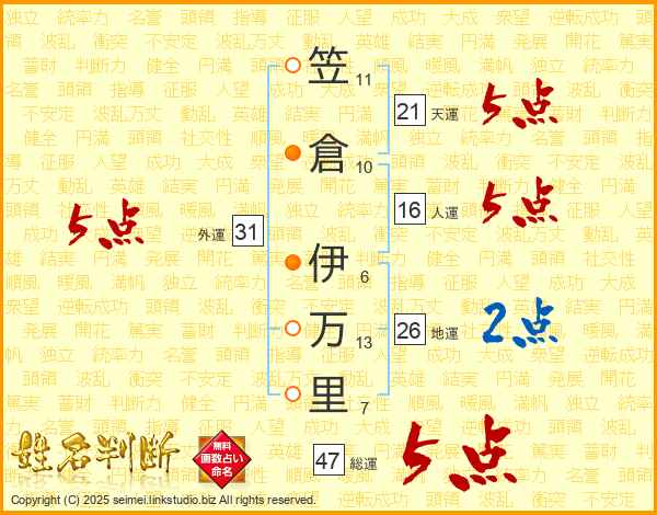 笠(11画)倉(10画) 伊(6画)万(13画)里(7画)