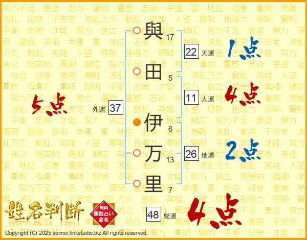 與(17画)田(5画) 伊(6画)万(13画)里(7画)