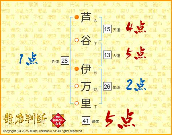 芦(8画)谷(7画) 伊(6画)万(13画)里(7画)