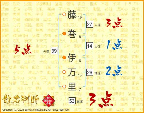 藤(19画)巻(8画) 伊(6画)万(13画)里(7画)