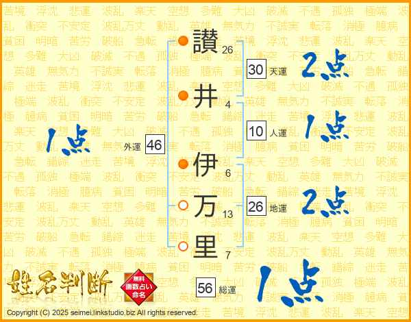 讃(26画)井(4画) 伊(6画)万(13画)里(7画)