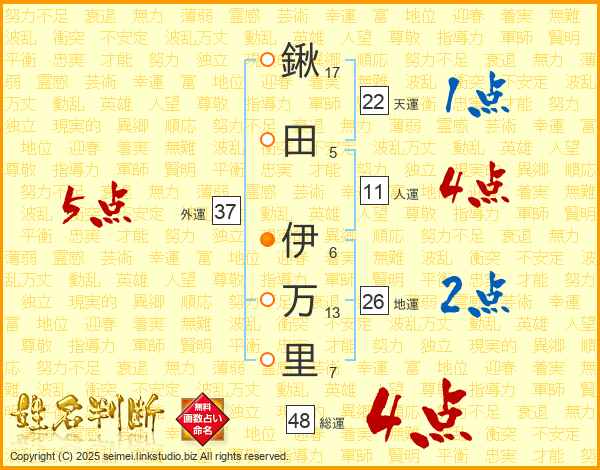 鍬(17画)田(5画) 伊(6画)万(13画)里(7画)