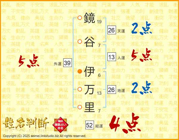 鏡(19画)谷(7画) 伊(6画)万(13画)里(7画)