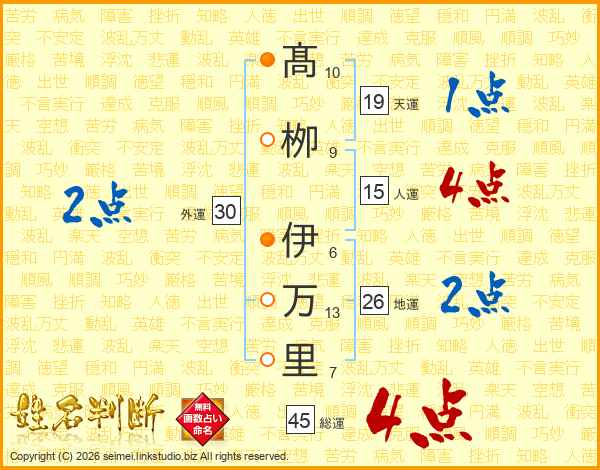 髙(10画)栁(9画) 伊(6画)万(13画)里(7画)