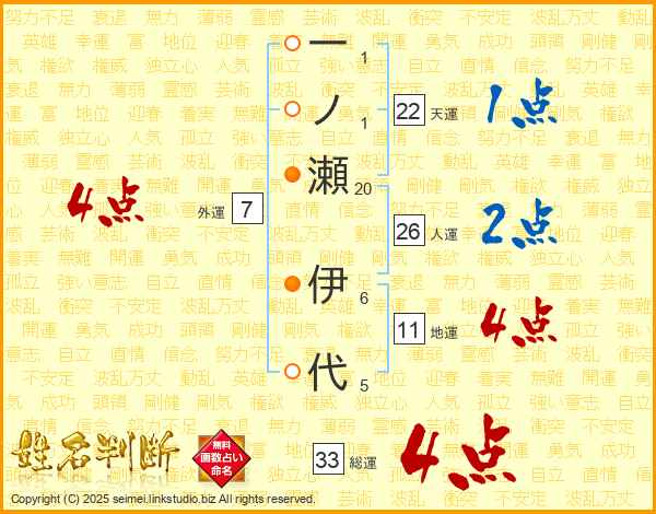 一(1画)ノ(1画)瀬(20画) 伊(6画)代(5画)