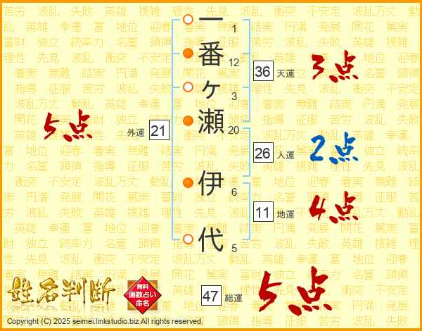 一番ヶ瀬伊代さんの総運は47画の5点!