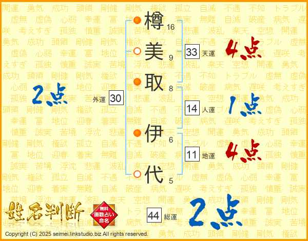 樽(16画)美(9画)取(8画) 伊(6画)代(5画)