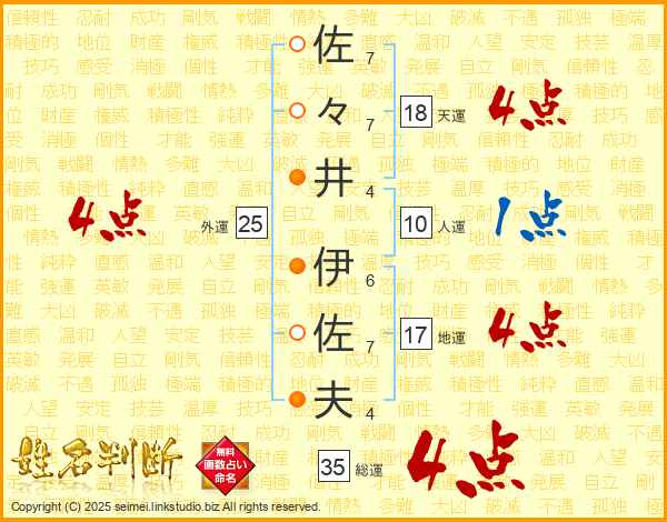 佐(7画)々(7画)井(4画) 伊(6画)佐(7画)夫(4画)