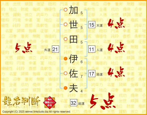 加(5画)世(5画)田(5画) 伊(6画)佐(7画)夫(4画)