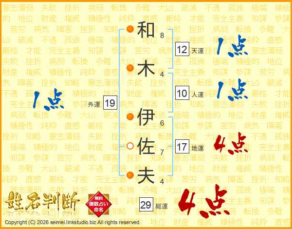 和(8画)木(4画) 伊(6画)佐(7画)夫(4画)
