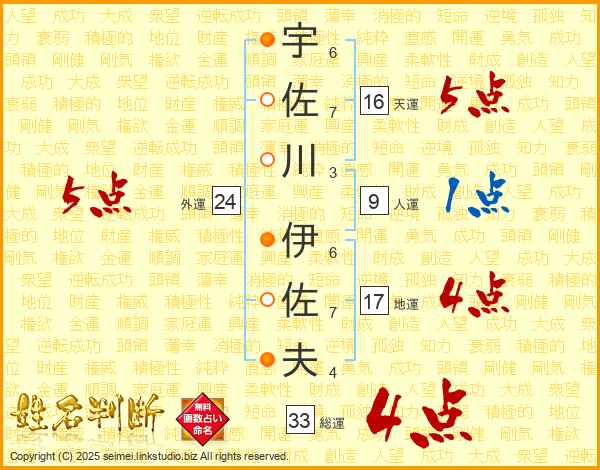 宇(6画)佐(7画)川(3画) 伊(6画)佐(7画)夫(4画)