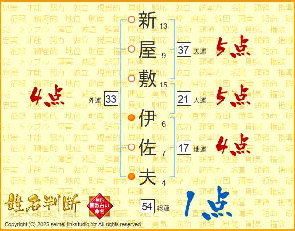 新屋敷伊佐夫さんの天運は37画の5点!