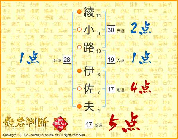 綾(14画)小(3画)路(13画) 伊(6画)佐(7画)夫(4画)
