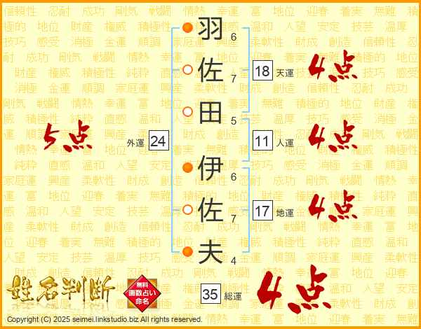 羽(6画)佐(7画)田(5画) 伊(6画)佐(7画)夫(4画)