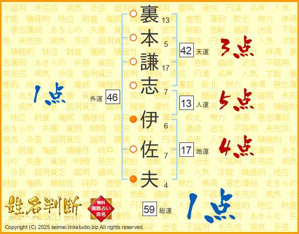 裏(13画)本(5画)謙(17画)志(7画) 伊(6画)佐(7画)夫(4画)