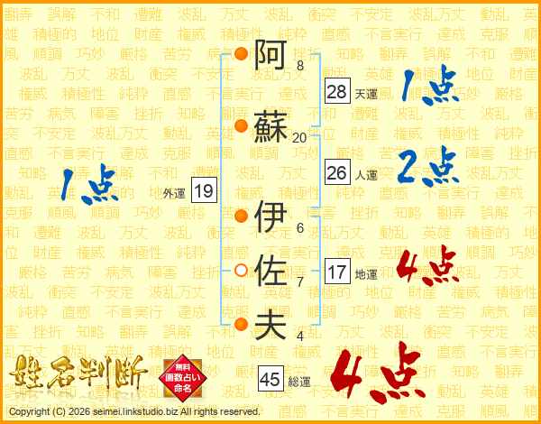 阿蘇伊佐夫さんの総運は45画の4点!