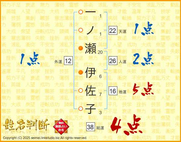 一ノ瀬伊佐子さんの総運は38画の4点!