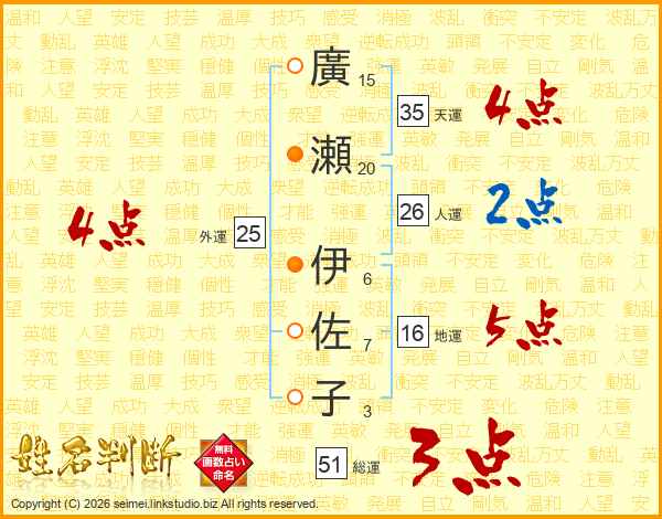 廣(15画)瀬(20画) 伊(6画)佐(7画)子(3画)