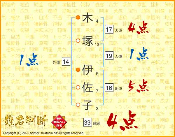 木塚伊佐子さんの総運は33画の4点!