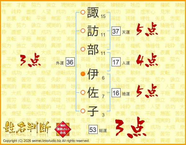 諏(15画)訪(11画)部(11画) 伊(6画)佐(7画)子(3画)