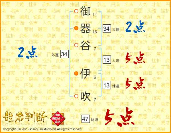 御(11画)器(16画)谷(7画) 伊(6画)吹(7画)