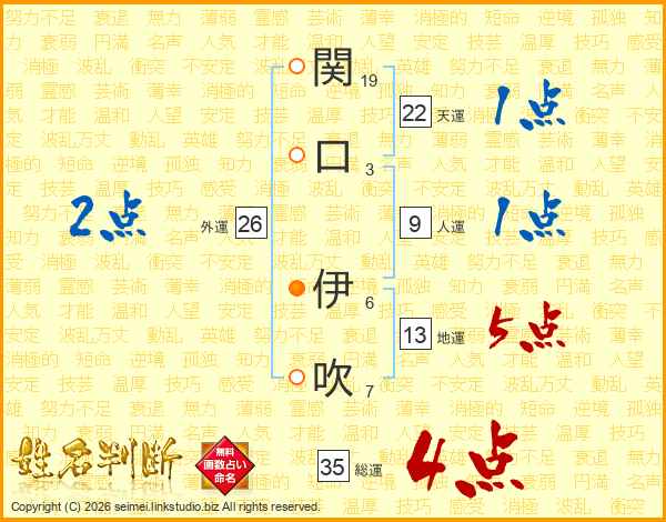 画数の奇数(○陽)と偶数(●陰)の配列で吉凶を占います。どちらかにかたよる名前は大凶名で避ける必要があります。画数の奇数偶数。